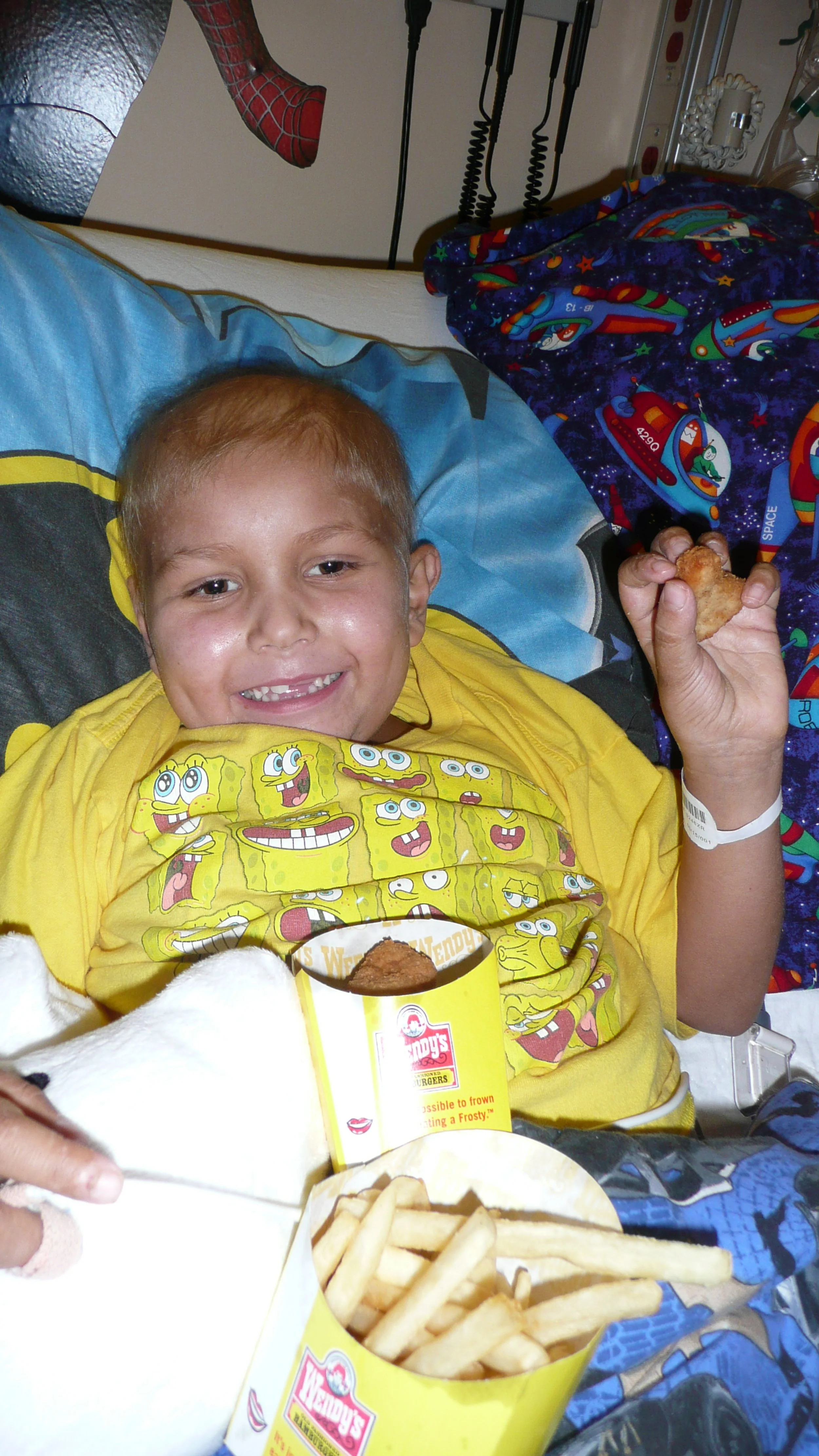 Eric generally would only eat a few things. His favorite foods, which accounted for probably 90% of his calories, consisted of Wendy’s Nuggets and fries, Little Caesars Pizza, Rice Krispy treats, and Kit Kat bars. Now it may seem like lousy parenting to let that be his diet, but with all the medications and other things going on it was easy for us to live with that. He was always funny about it because even though we bought the same food almost every day, each time we went through Wendy’s drive-through he would ask about 20 times if we were clear about what he wanted. He would make all of us laugh every time because he just kept asking, even while we would be ordering through the intercom.